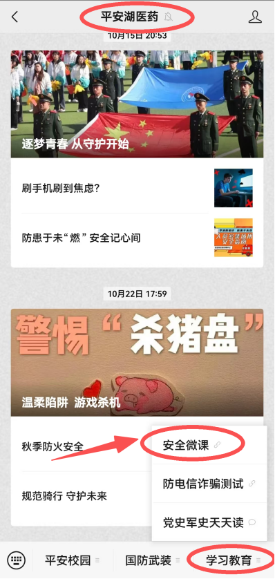 1.手机扫描下方二维码关注微信公众号“平安湖医药”,进入后点击菜单栏【学习教育】--【安全微课】--【开始学习】,进入登录页面,输入学校名称、账号、密码(账号和密码均为学生本人学号)信息后,点击“登录”进入平台;