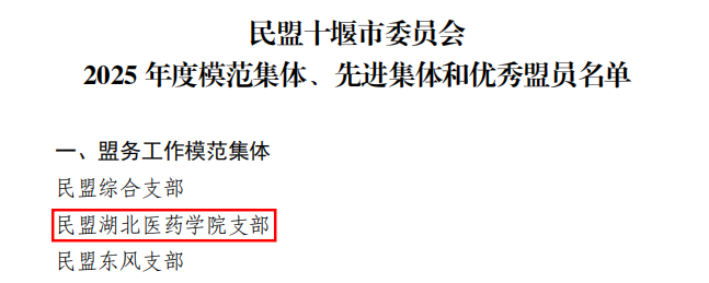 本网讯(通讯员何志凯)近日,民盟十堰市委会在十堰市党派办14楼会议室召开六届二十次(扩大)会议暨2025年度总结表彰大会。会上,对2025年度优秀支部、优秀盟员进行了表彰。民盟湖北医药学院支部荣获“盟务工作模范集体”,基础医学院赵虎子、第一临床学院王刚荣获“优秀盟员”称号。
